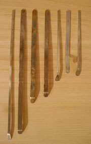 サムピアノの鍵盤。ステンレスや鉄・真鍮など素材が違う物や形が違う物で実験した。今回は鍵盤も全て自作。